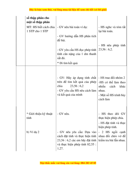 Giáo án Bài 70 Toán lớp 5: Chia một số thập phân cho một số thập phân