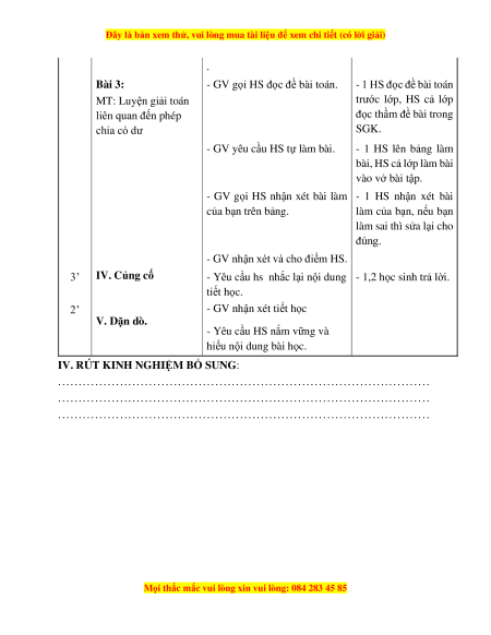 I.Ổn định tổ chức - Hát đầu giờ. - học sinh hát. 3’ II.Kiểm tra bài cũ - GV hỏi: - 2 HS lên bảng + Nêu cách chia 1 STN cho 1 - Nhận xét, bổ sung STN còn dư? Cho VD? - GV nhận xét, cho điểm 30’ III. Bài mới.
