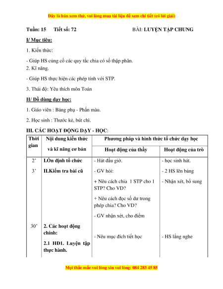 Tuần: 15 Tiết số: 72 BÀI: LUYỆN TẬP CHUNG I/ Mục tiêu: 1. Kiến thức: