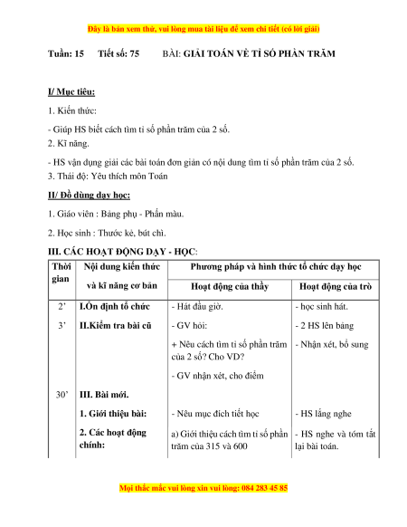 Tuần: 15 Tiết số: 75 BÀI: GIẢI TOÁN VỀ TỈ SỐ PHẦN TRĂM I/ Mục tiêu: 1. Kiến thức: