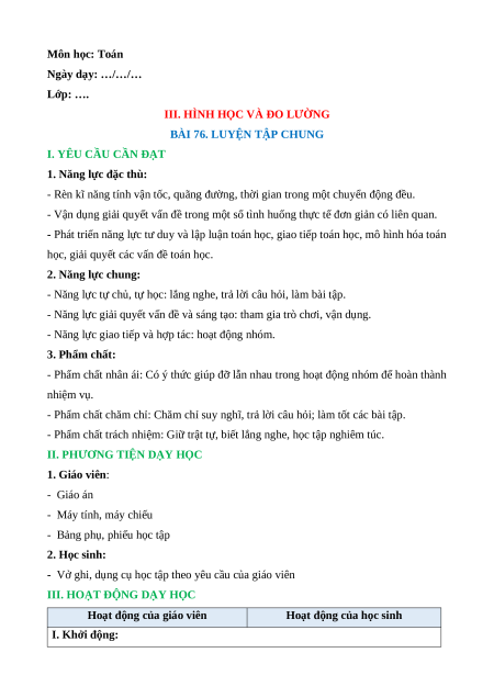 Giáo án Bài 76: Luyện tập chung Toán lớp 5 Cánh diều
