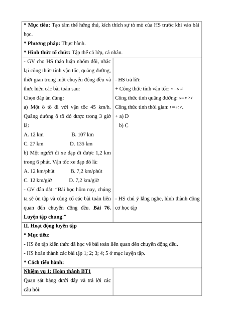 - HS ôn tập kiến thức đã học về bài toán liên quan đến chuyển động đều.