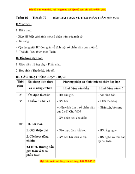 Tuần: 16 Tiết số: 77 BÀI: GIẢI TOÁN VỀ TỈ SỐ PHẦN TRĂM (tiếp theo) I/ Mục tiêu: 1. Kiến thức: