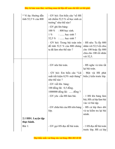 - GV nêu bài toán ví dụ. - HS nghe và tóm tắt chính: lại bài toán. 2.1 HĐ1. Hướng dẫn giải toán về tỉ số phần trăm