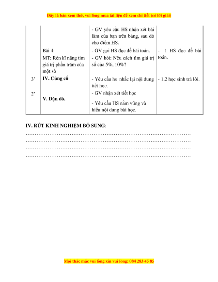 - GV hỏi: Nêu cách tìm giá trị toán. giá trị phần trăm của số của 5%, 10%? một số 3’ IV. Củng cố
