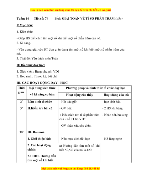 Tuần: 16 Tiết số: 79 BÀI: GIẢI TOÁN VỀ TỈ SỐ PHẦN TRĂM (tiếp) I/ Mục tiêu: 1. Kiến thức: