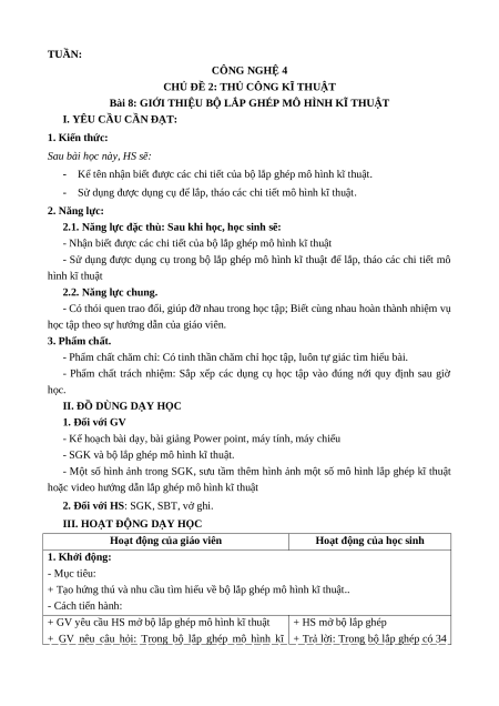 - Sử dụng được dụng cụ trong bộ lắp ghép mô hình kĩ thuật để lắp, tháo các chi tiết mô hình kĩ thuật 2.2. Năng lực chung.