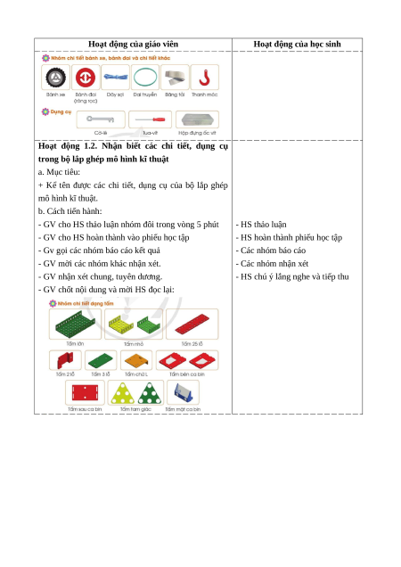 Hoạt động 1.1. Nhận biết chi tiết, dụng cụ trong bộ