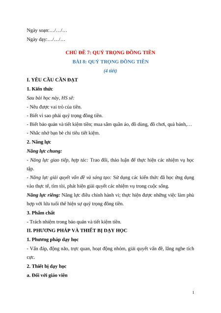 BÀI 8: QUÝ TRỌNG ĐỒNG TIỀN (4 tiết)