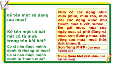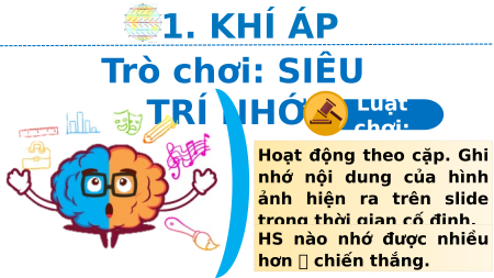 KHỞI ĐỘNG TRÒ CHƠI NỐI CHỮ GV chỉ định 1 GV bắt HS tìm từ có Tương Thời HS không đầu trước nghĩa nối tự, HS gian nối được bằng từ vào, bắt đầu tiếp mỗi từ: hoặc từ “khí áp” bằng từ cuối theo 5 tiếng nối không hoặc “mưa mà GV vừa nối vào đếm có nghĩa gió” nói. loại NỐI CHỮ