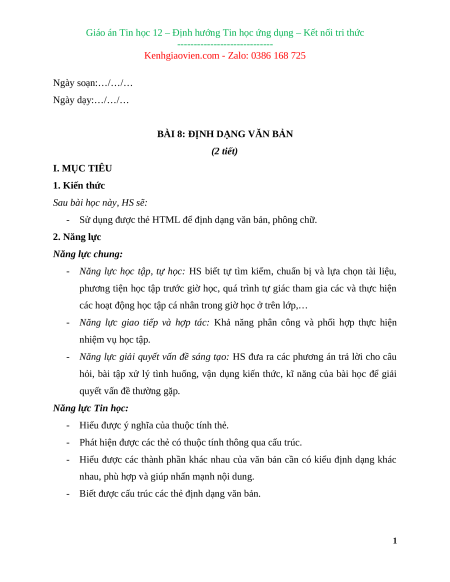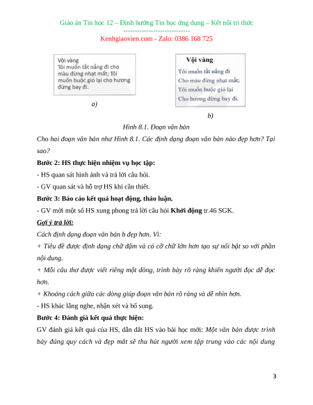 Giáo án Bài 8: Định dạng văn bản Tin học 12 Kết nối tri thức