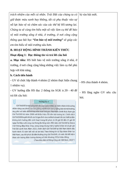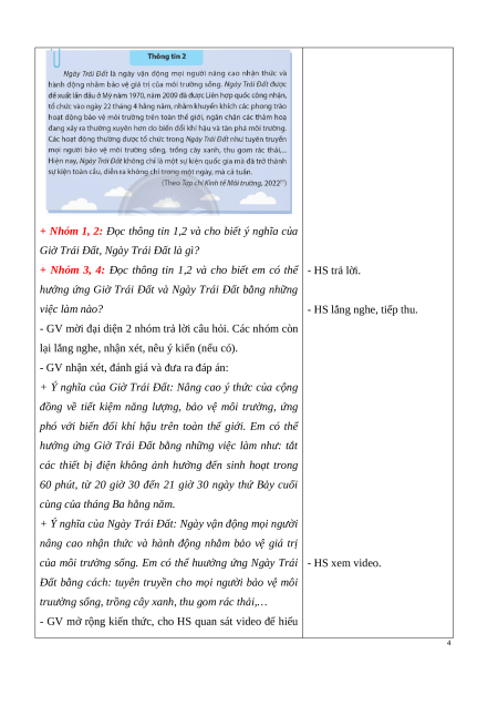 hưởng ứng Giờ Trái Đất và Ngày Trái Đất bằng những việc làm nào? - HS lắng nghe, tiếp thu.