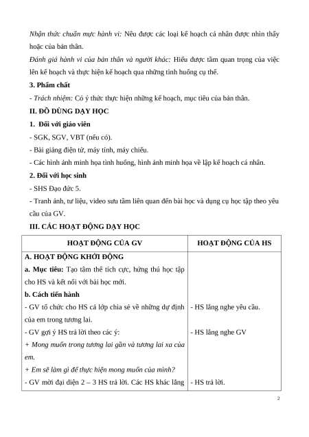lên kế hoạch và thực hiện kế hoạch qua những tình huống cụ thể. 3. Phẩm chất