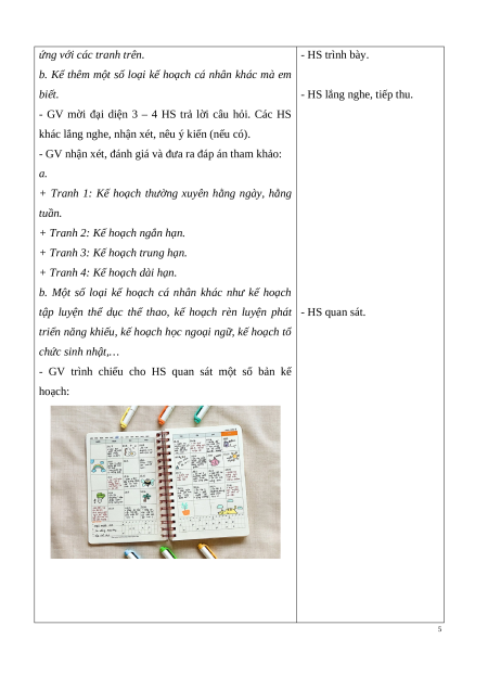a. Mục tiêu: HS nêu được các loại kế hoạch cá nhân. b. Cách tiến hành