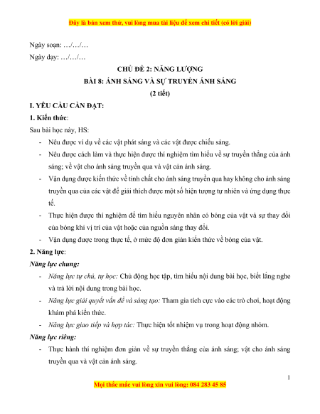 BÀI 8: ÁNH SÁNG VÀ SỰ TRUYỀN ÁNH SÁNG (2 tiết)