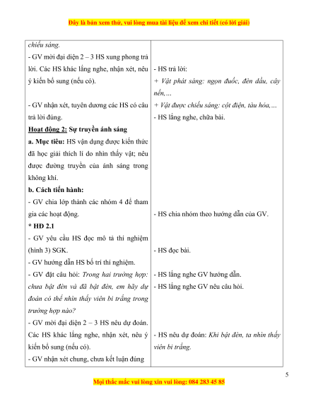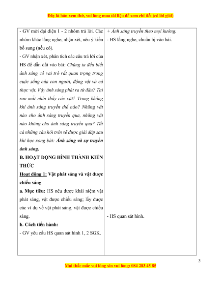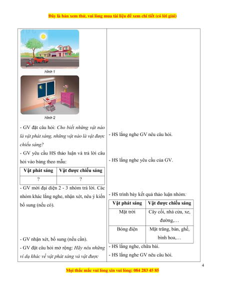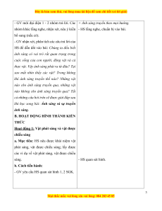 các ví dụ về vật phát sáng, vật được chiếu sáng. - HS quan sát hình. b. Cách tiến hành: