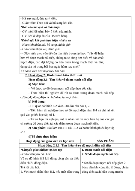Hoạt động 2.1: Tìm hiểu về đoạn mạch nối tiếp a) Mục tiêu: