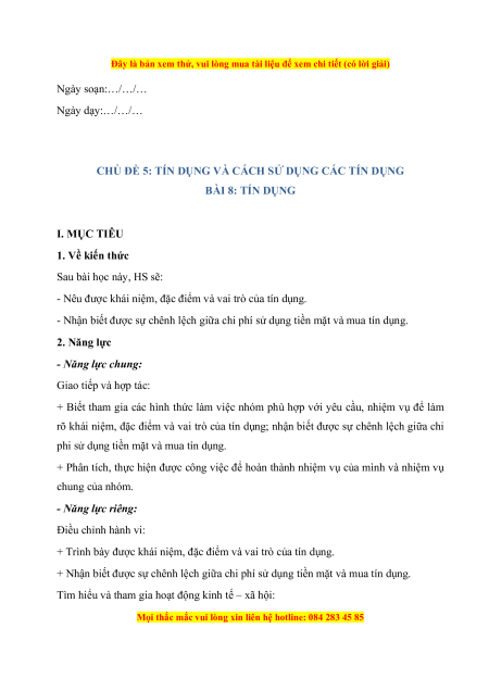 CHỦ ĐỀ 5: TÍN DỤNG VÀ CÁCH SỬ DỤNG CÁC TÍN DỤNG BÀI 8: TÍN DỤNG I. MỤC TIÊU 1. Về kiến thức Sau bài học này, HS sẽ: