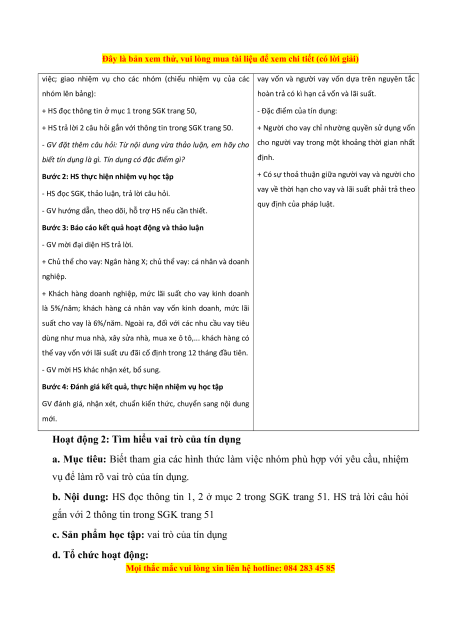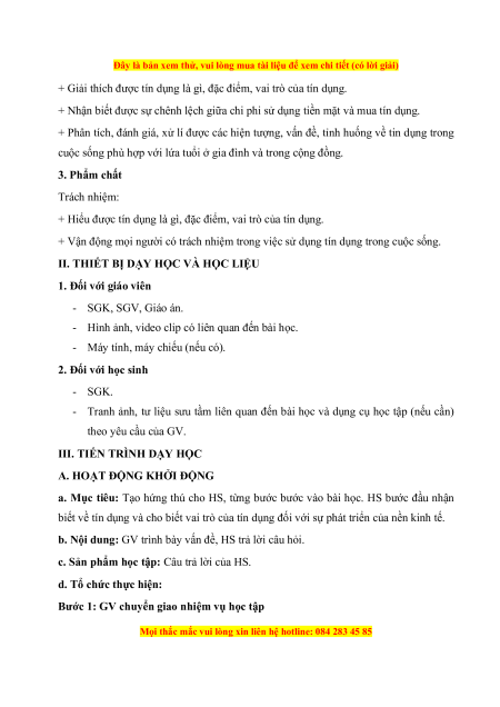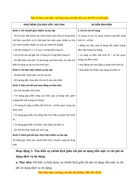 - Nhận biết được sự chênh lệch giữa chi phí sử dụng tiền mặt và mua tín dụng. 2. Năng lực - Năng lực chung: Giao tiếp và hợp tác: