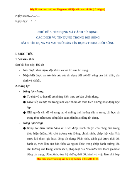 BÀI 8: TÍN DỤNG VÀ VAI TRÒ CỦA TÍN DỤNG TRONG ĐỜI SỐNG I. MỤC TIÊU 1. Về kiến thức Sau bài học này, HS sẽ:
