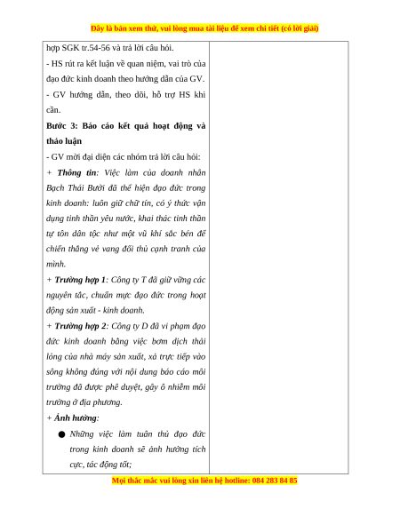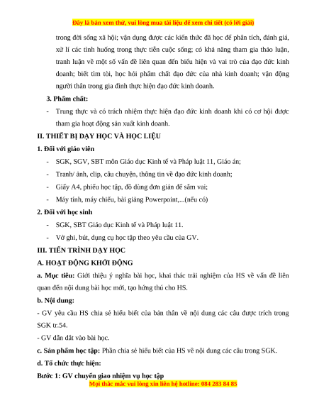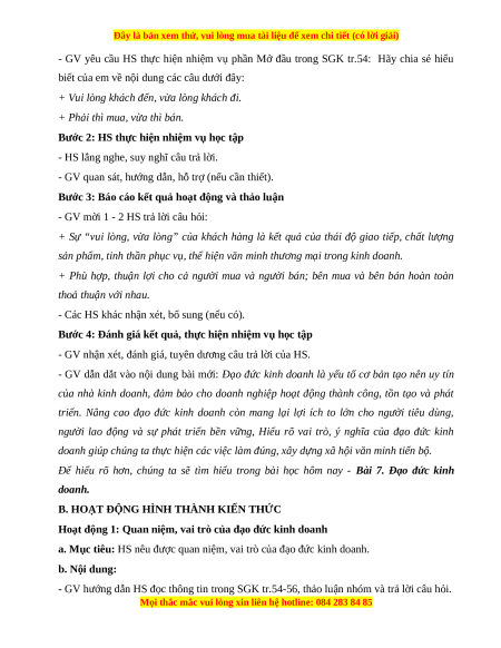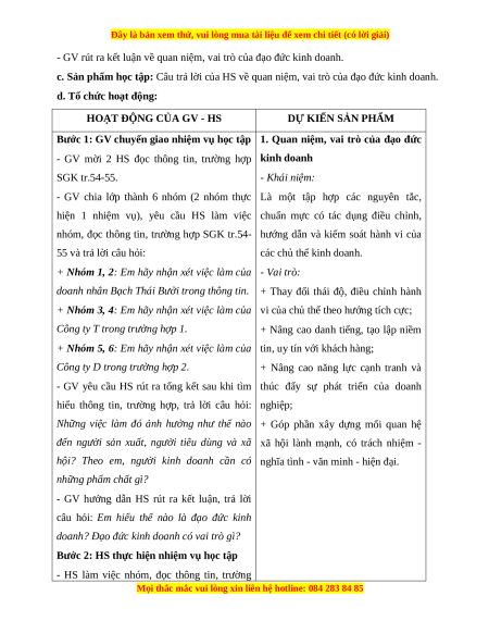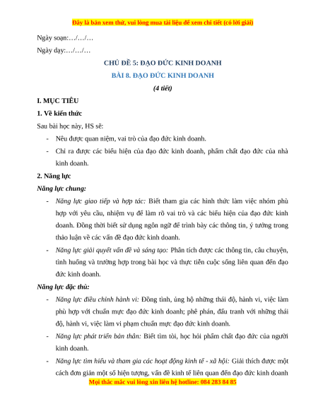 BÀI 8. ĐẠO ĐỨC KINH DOANH (4 tiết) I. MỤC TIÊU 1. Về kiến thức Sau bài học này, HS sẽ: