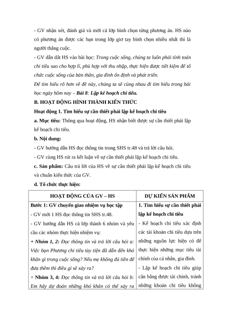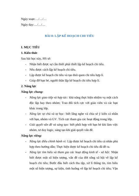 BÀI 8: LẬP KẾ HOẠCH CHI TIÊU I. MỤC TIÊU 1. Kiến thức Sau bài học này, HS sẽ: