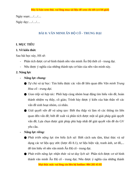 BÀI 8: VĂN MINH ẤN ĐỘ CỔ - TRUNG ĐẠI I. MỤC TIÊU 1. Về kiến thức Sau bài học này, HS sẽ: