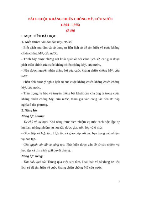 BÀI 8: CUỘC KHÁNG CHIẾN CHỐNG MỸ, CỨU NƯỚC (1954 – 1975) (3 tiết)