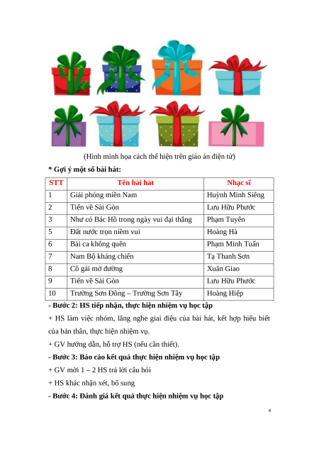 * Gợi ý một số bài hát: STT Tên bài hát Nhạc sĩ 1 Giải phóng miền Nam Huỳnh Minh Siêng 2 Tiến về Sài Gòn Lưu Hữu Phước 3