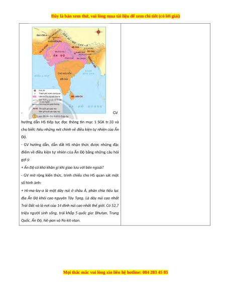 - HS đọc thông tin mục 1 SGK tr.33 để nêu được những nét chính về điều kiện tự nhiên của Ấn Độ.