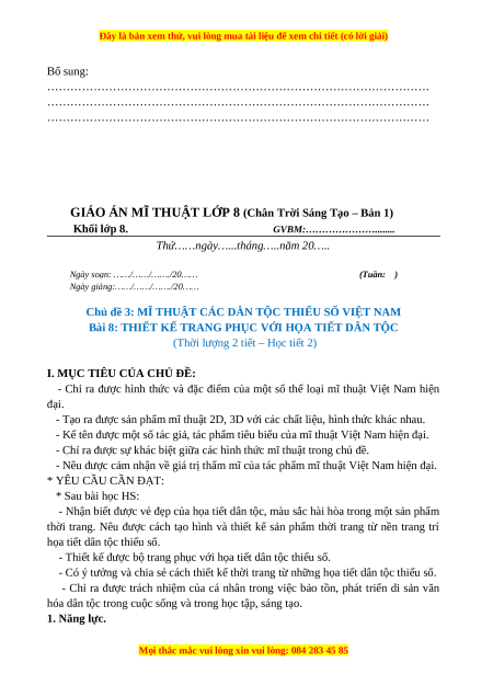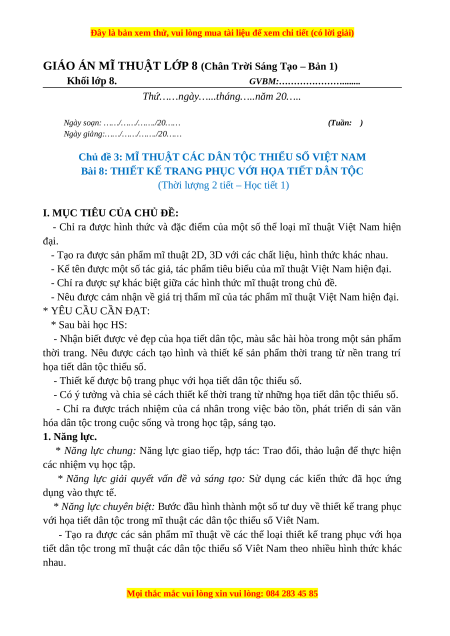 Bộ giáo án Mĩ thuật 8 Chân trời sáng tạo được cập nhật liên tục trong gói này từ nay đến hết tháng 3/2024.