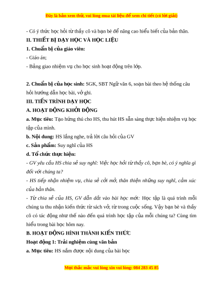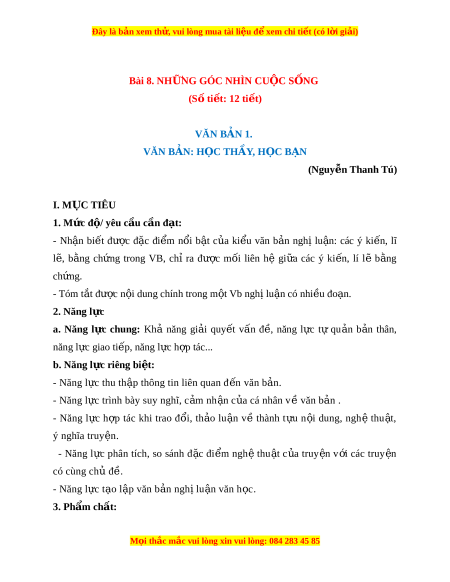 Đây là bản xem th , vu ử i lòng mua tài li u ệ đ xe ể m chi ti t ế (có l i ờ gi i ả ) Bài 8. NH N Ữ G GÓC NHÌN CU C Ộ S N Ố G (S t ố i t ế : 12 ti t ế ) VĂN BẢN 1. VĂN BẢN: H C Ọ THẦY, H C Ọ BẠN (Nguy n ễ Thanh Tú) I. M C Ụ TIÊU 1. Mức đ / ộ yêu c u c ầ n đ ầ t ạ : - Nh n ậ bi t ế đư c ợ đ c ặ đi m ể n i ổ b t ậ c a ủ ki u ể văn b n ả nghị lu n: ậ các ý ki n, ế lĩ lẽ, b ng ằ ch ng ứ trong VB, chỉ ra đư c ợ m i ố liên hệ gi a ữ các ý ki n, ế lí lẽ b ng ằ ch ng. ứ - Tóm t t ắ đư c ợ n i ộ dung chính trong m t ộ Vb ngh l ị u n có nhi ậ u ề đo n. ạ 2. Năng l c ự a. Năng l c