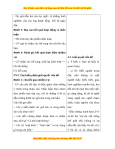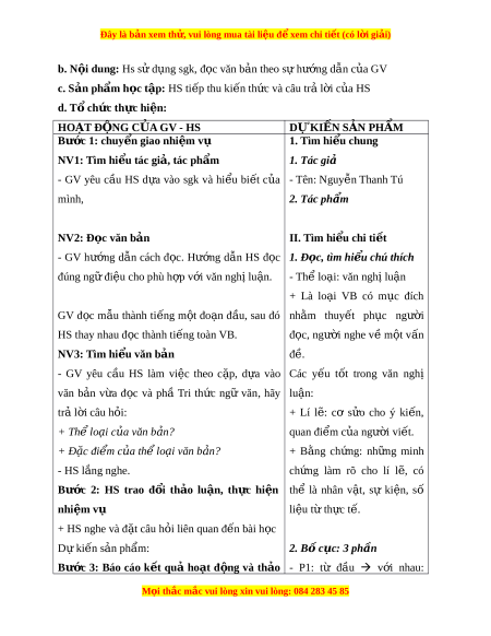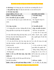 ộ dung: Hs sử d ng s ụ gk, đ c văn b ọ n ả theo sư hư ng d ớ n c ẫ a G ủ V c. Sản phẩm h c t ọ p: ậ HS ti p t ế hu ki n t ế h c và ứ câu tr l ả i ờ c a ủ HS d. T ch ổ ức thực hi n: ệ HOẠT Đ N Ộ G C A Ủ GV - HS D K Ự IẾN SẢN PHẨM Bư c ớ 1: chuy n gi ể ao nhi m ệ vụ 1. Tìm hi u chung ể NV1: Tìm hi u t ể ác gi , t ả ác ph m ẩ 1. Tác giả - GV yêu c u ầ HS d a ư vào sgk và hi u ể bi t ế c a ủ - Tên: Nguy n ễ Thanh Tú mình, 2. Tác phẩm NV2: Đ c ọ văn bản II. Tìm hi u chi ể ti t ế - GV hư ng ớ d n ẫ cách đ c ọ . Hư ng ớ d n ẫ HS đ c ọ 1. Đ c