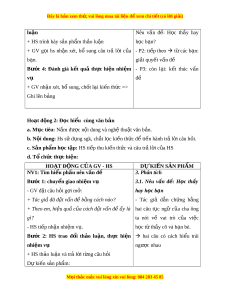 ọ , tìm hi u chú t ể hích đúng ng đi ữ ệu cho phù h p ợ v i ớ văn nghị lu n. ậ - Thể lo i ạ : văn ngh l ị u n ậ + Là lo i ạ VB có m c ụ đích GV đ c ọ m u ẫ thành ti ng ế m t ộ đo n ạ đ u, ầ sau đó nh m ằ thuy t ế ph c ụ ngư i ờ HS thay nhau đ c ọ thành ti ng t ế oàn VB. đ c, ọ ngư i ờ nghe v ề m t ộ v n â NV3: Tìm hi u văn b ể n ả đ . ề - GV yêu c u ầ HS làm vi c ệ theo c p, ặ d a ư vào Các y u ế t t ố trong văn nghị văn b n ả v a ừ đ c ọ và phầ Tri th c ứ ngữ văn, hãy lu n: ậ tr l ả i ờ câu h i ỏ : + Lí l : ẽ cơ s o ử cho ý ki n, ế + Th l ể o i ạ c a văn ủ b n? ả quan đi m ể c a ng ủ ư i ờ vi t ế . + Đ c ặ đi m ể c a t ủ h l ể o i ạ văn b n? ả + B ng ằ ch ng: ứ nh ng ữ minh - HS l ng nghe. ắ ch ng ứ làm rõ cho lí l , ẽ có Bư c ớ 2: HS trao đ i ổ th o ả lu n, ậ th c ự hi n ệ thể là nhân v t ậ , sư ki n, ệ số nhi m ệ vụ liệu từ th c ư t . ế + HS nghe và đ t ặ câu h i ỏ liên quan đ n bài ế h c ọ Dư ki n s ế n ả phẩm: