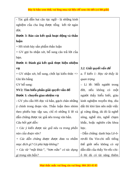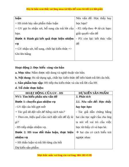 ộ dung: Hs sử d ng s ụ gk, ch t ắ l c ọ ki n t ế h c đ ứ t ể i n hành t ế r l ả i ờ câu h i ỏ . c. Sản phẩm h c t ọ p: ậ HS ti p t ế hu ki n t ế h c và ứ câu tr l ả i ờ c a ủ HS d. T ch ổ ức thực hi n: ệ HOẠT Đ N Ộ G C A Ủ GV - HS D K Ự IẾN SẢN PHẨM NV1: Tìm hi u ể phầu nêu v n đ ấ ề 3. Phân tích Bư c ớ 1: chuy n gi ể ao nhi m ệ vụ 3.1. Nêu v n ấ đ : ề H c ọ th y ầ - GV đ t ặ câu h i ỏ g i ợ m : ở hay h c b ọ ạn + Tác giả đã đ t ặ v n đ ấ b ề ng ằ cách nào? - Tác giả d n ẫ ch ng ứ b ng ằ + Theo em, hi u qu ệ c ả a cách đ ủ t ặ v n đ ấ ề y l ấ à hai câu t c ụ ngữ c a ủ cha ông gì? ta nói về vai trò c a ủ vi c ệ - HS ti p nh ế n ậ nhi m ệ v . ụ h c t ọ t ừ hầy cô và b n ạ bè. Bư c ớ 2: HS trao đ i ổ th o ả lu n, ậ th c ự hi n ệ hai câu có cách hi u ể trái nhi m ệ vụ ngư c nhau ợ + HS th o l ả u n và ậ tr l ả i ờ t ng câu h ừ i ỏ D ki ư n s ế n ả phẩm: M i ọ thắc m c