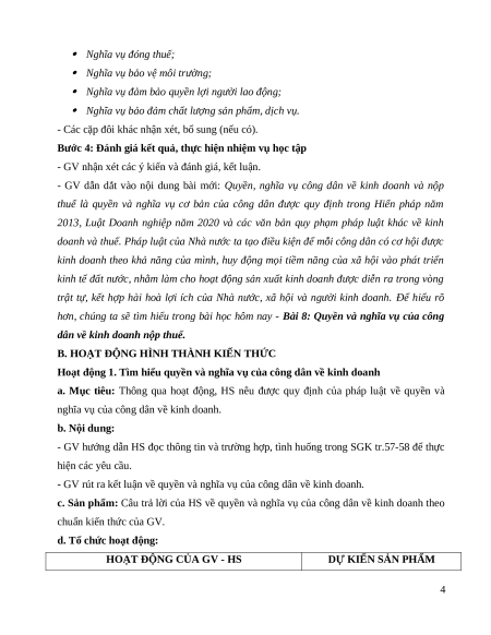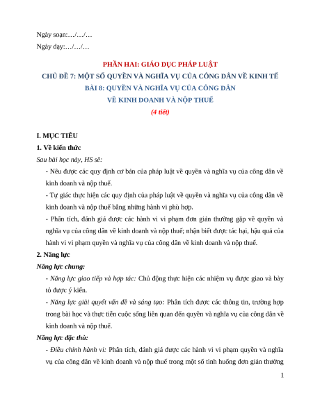 VỀ KINH DOANH VÀ NỘP THUẾ (4 tiết) I. MỤC TIÊU 1. Về kiến thức