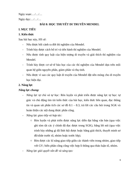 BÀI 8: HỌC THUYẾT DI TRUYỀN MENDEL I. MỤC TIÊU 1. Kiến thức Sau bài học này, HS sẽ: