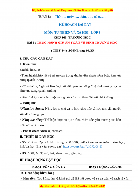 Giáo án Bài 8: Thực hành giữ vệ sinh an toàn trong trường học Tự nhiên và xã hội lớp 3 Chân trời sáng tạo