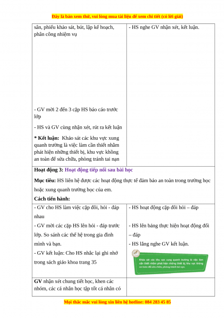 Mục tiêu: HS liên hệ được các hoạt động thực tế đảm bảo an toàn trong trường học