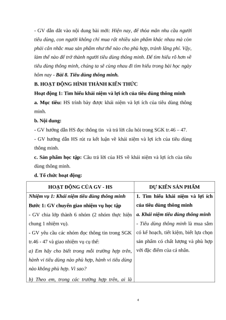 - GV chia lớp thành 6 nhóm (2 nhóm thực hiện a. Khái niệm tiêu dùng thông minh chung 1 nhiệm vụ).