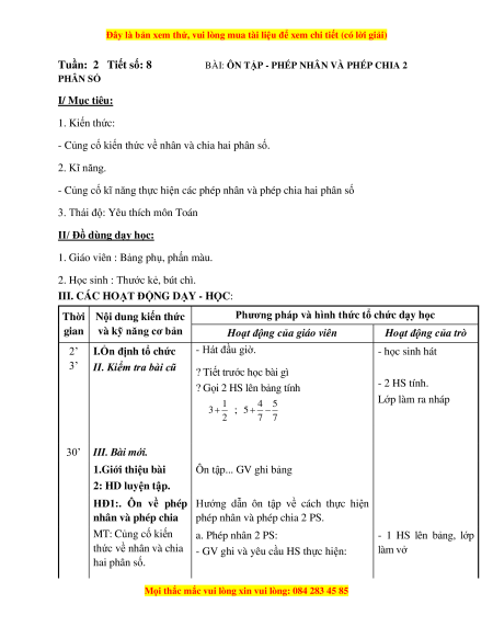 Tuần: 2 Tiết số: 8 BÀI: ÔN TẬP - PHÉP NHÂN VÀ PHÉP CHIA 2 PHÂN SỐ I/ Mục tiêu: 1. Kiến thức: