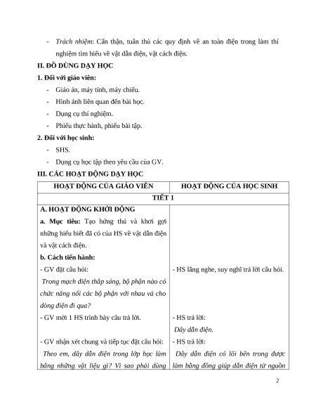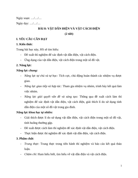 - Ứng dụng của vật dẫn điện, vật cách điện trong một số đồ vật. 2. Năng lực: