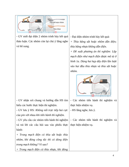 thảo luận. Các nhóm còn lại chú ý lắng nghe + Thìa bằng sắt hoặc nhôm dẫn điện; và bổ sung.