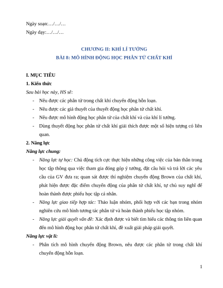 BÀI 8: MÔ HÌNH ĐỘNG HỌC PHÂN TỬ CHẤT KHÍ I. MỤC TIÊU 1. Kiến thức