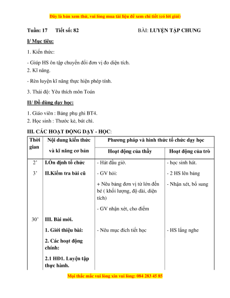 - Giúp HS ôn tập chuyển đổi đơn vị đo diện tích. 2. Kĩ năng.