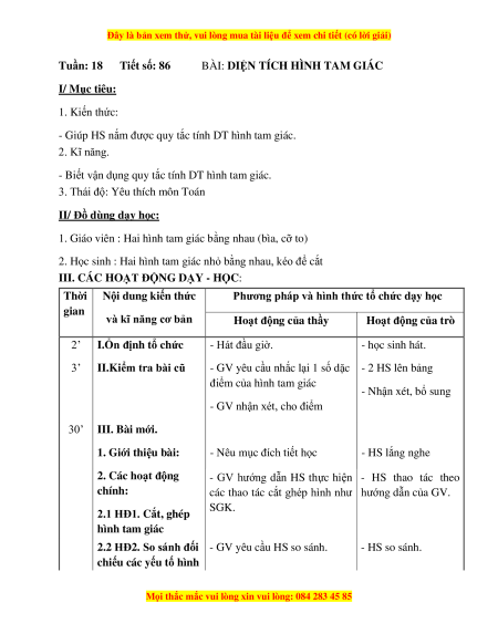 Tuần: 18 Tiết số: 86 BÀI: DIỆN TÍCH HÌNH TAM GIÁC I/ Mục tiêu: 1. Kiến thức: