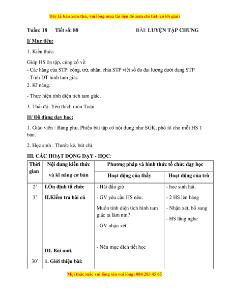 Tuần: 18 Tiết số: 88 BÀI: LUYỆN TẬP CHUNG I/ Mục tiêu: 1. Kiến thức: