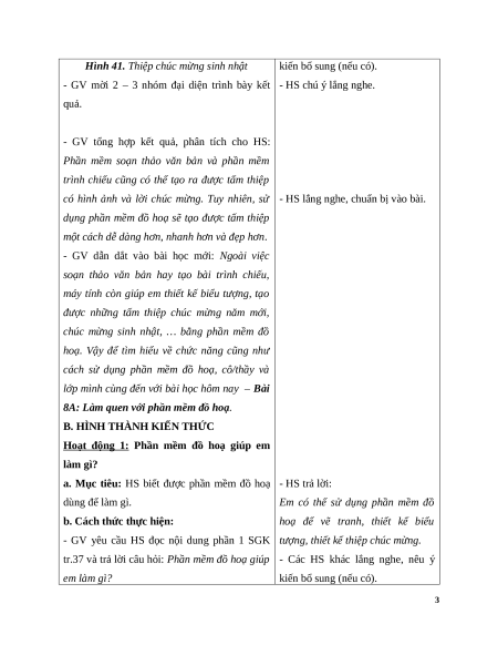 tr.37 và trả lời câu hỏi: Phần mềm đồ hoạ giúp - Các HS khác lắng nghe, nêu ý em làm gì? kiến bổ sung (nếu có). 3 - HS chú ý lắng nghe.
