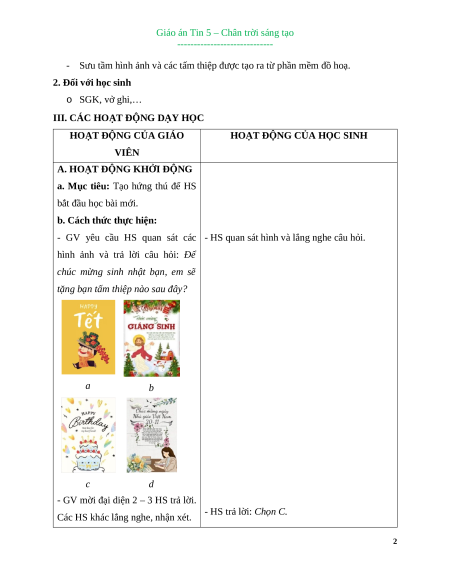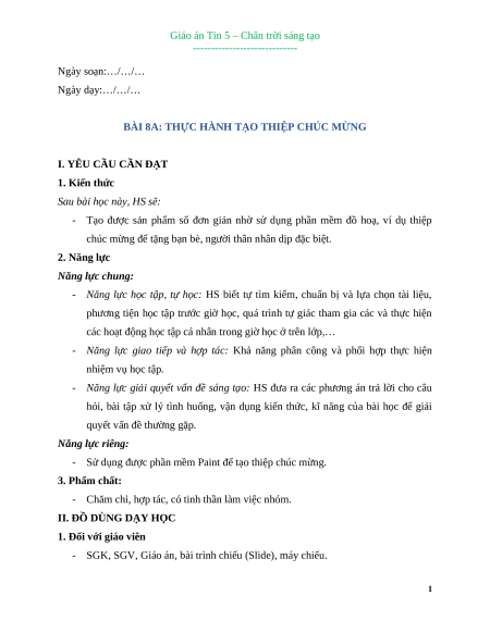 Giáo án Bài 8A: Thực hành tạo thiệp chúc mừng Tin học lớp 5 Chân trời sáng tạo
