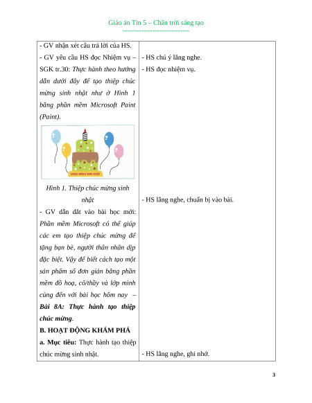 a. Mục tiêu: Thực hành tạo thiệp chúc mừng sinh nhật. - HS lắng nghe, ghi nhớ. 3